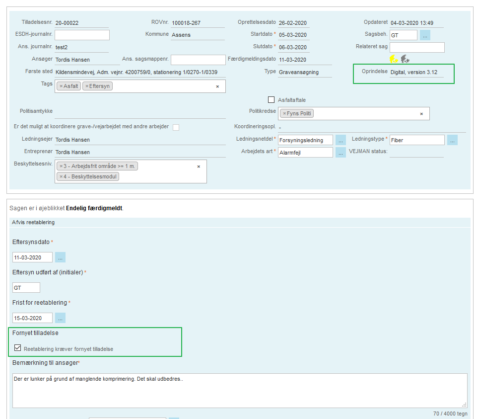 Ved afvisningen af retablering kan sagsbehandleren kræve, at ledningsejeren/ansøgeren skal indhente en ny/fornyet tilladelse for det tidspunkt, hvor manglerne skal udbedres.