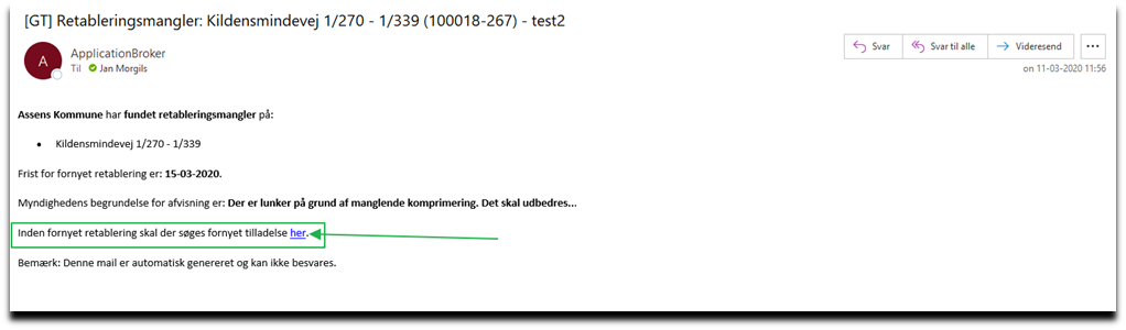 Ansøger får en mail med et direkte link til at søge om fornyet tilladelse