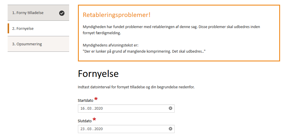 Forny tilladelse, som vil vise de sager hvor myndigheden har krævet at man skal lave en fornyet ansøgning til brug for retableringen.