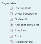 Hvis ansøger annullerer en sag, der er godkendt og startdatoen er overskredet, vil sagsbehandleren nu skulle godkende eller afvise anmodningen. Sagen vil ligge med status ”Anmodet annulleret”, som kan vælges i sagsoversigten.