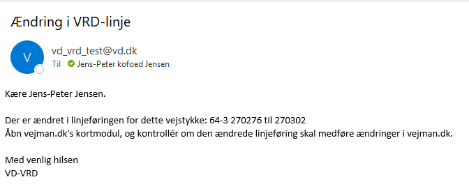 •Hvis vejen nedlægges i GeoDK eller geometrien ændres med mere end 3 meter, så bliver vejstrækningen automatisk frakoblet VRD, og du får tilsendt en notifikationsmail herom. Dog forudsat at du er registreret som ansvarlig for referencesystemændringer (se nedenfor under systemadministration). Når du får mailen, skal du så tage stilling til, om vejstrækningen skal nedlægges i http://vejman.dk , eller om vejen skal kobles til en anden VRD-linje.