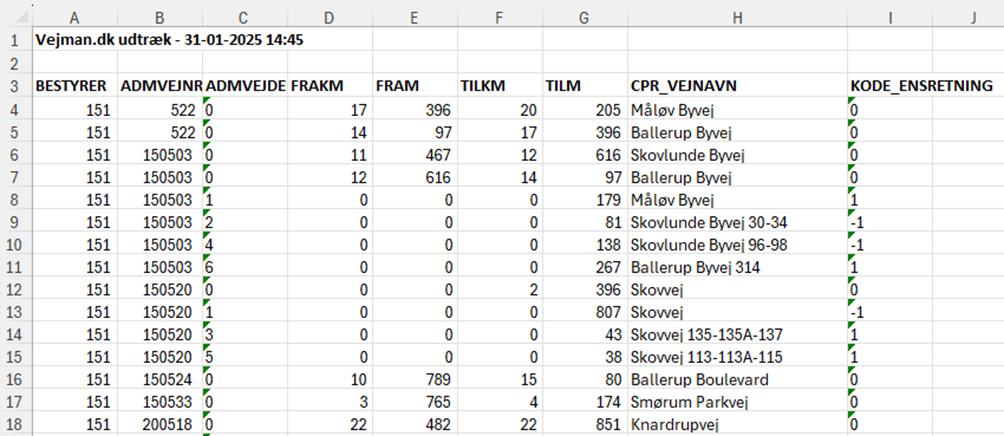 Bestyrer, Admvejnr, Admvejdel, Frakm, Fram, Tilkm, Tilm, Cpr_vejnavn, Kode(Ensretning)