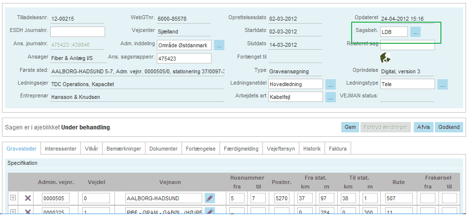 Man kan altid ændre sagsbehandleren ved at vælge en anden fra vejmyndigheden i drop-down menuen i identifikationstoppen og herefter klikke Gem.