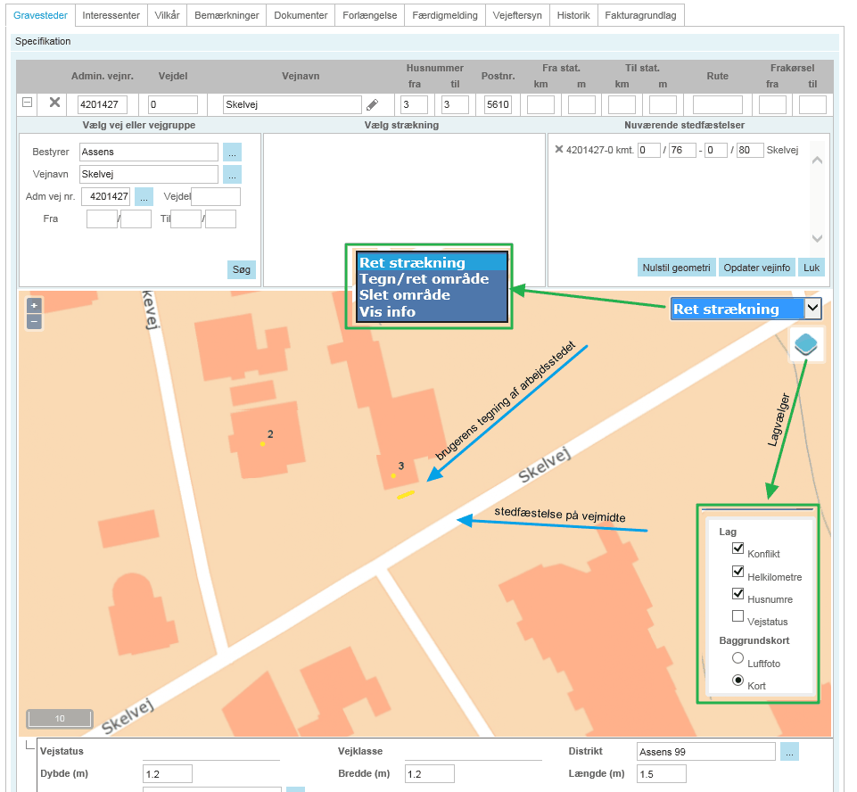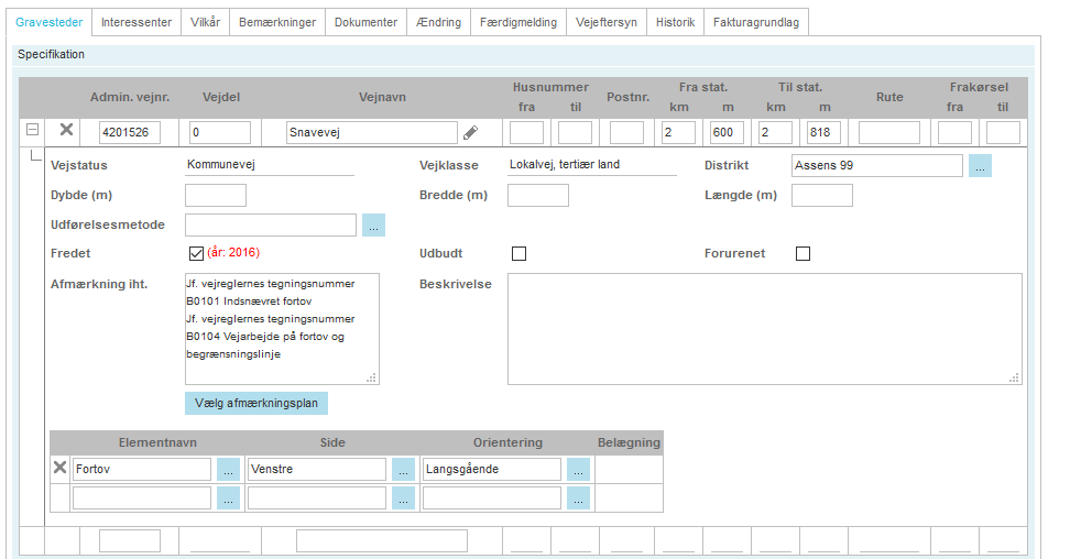 Felterne: vejstatus, Vejklasse, Distrikt, Fredet (året), Udbudt, Forurenet udfyldes automatisk når en sag stedfæstes.