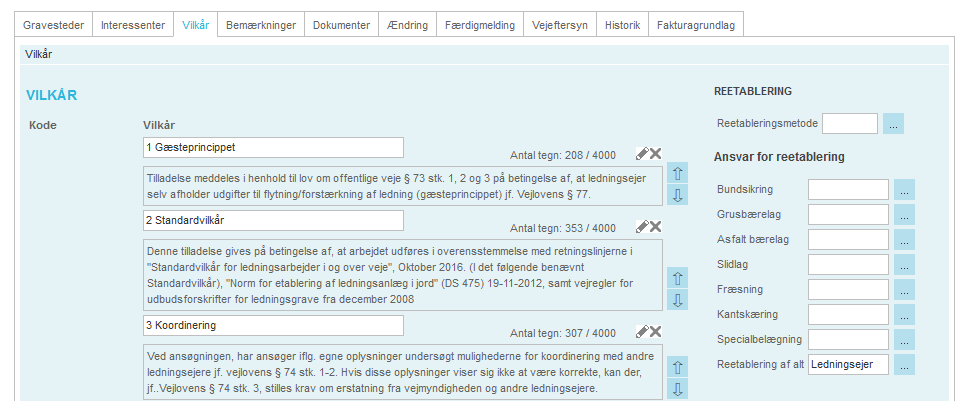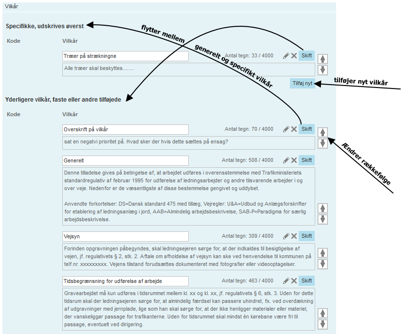Knappen ”Tilføj” tilføjer et vilkår med overskriften: ”Koordinering”, med teksten udfyldt med et sæt grundoplysninger (ansøger, kontaktperson, telefonnumre, og sagsnummer) på ansøger på stedet med krav om koordinering. Du kan selv rette og tilføje i denne tekst. Både overskrift og vilkårstekst (det sidste via ’blyant’-ikonen )