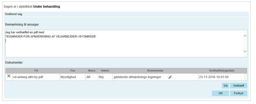 OBS. Hvis sagen er digital vil bemærkninger til ansøger blive sendt med næste gang du enten godkender, eller afviser en konkret handling.
