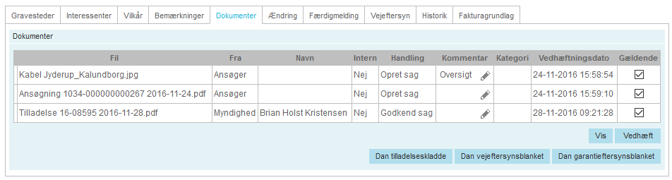 Alle dokumenter der vedhæftes i handlingsrammen under sagsforløbet i forbindelse med godkendelser, afvisninger og færdigmeldinger, vil også kunne ses på fanen Dokumenter.
