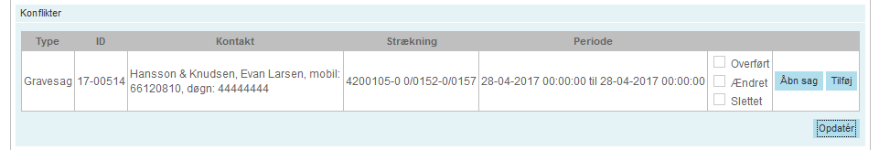 Knappen ”Opdater”: Henter data fra http://vejman.dk (og vejarbejder o.a). og viser alle ansøgningstyper (grave-, materiel- og arrangementssager samt vejarbejder), der overlapper på sted og tid. Man kan opdatere når som helst under arbejdet med at give tilladelsen, for at få eventuelle ændringer med inden man giver en godkendelse af en sag.