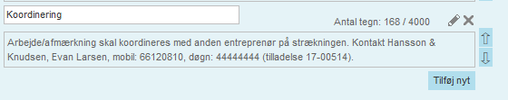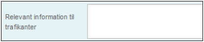 ![]() | Brug evt. dette tekstfelt til kort at beskrive særlige forhold omkring stedet, aktivi-teten eller tidspunktet for den. Feltet må IKKE indeholde personoplysninger. Skriv altid i feltet, om aktiviteten kun påvirker trafikanterne i én retning og i så fald hvilken. |