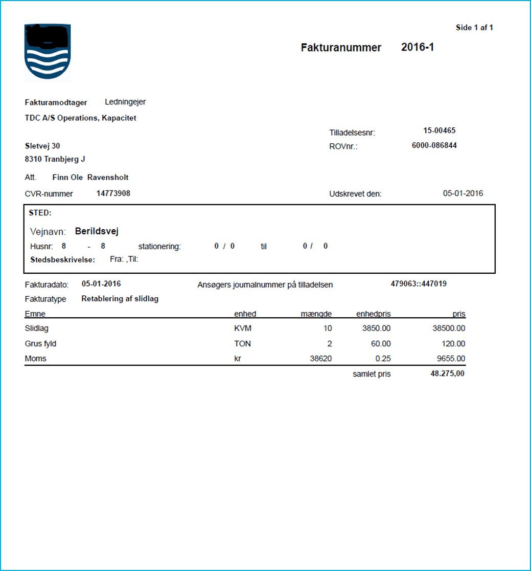 Her er ledningsejer valgt som modtager, og fakturatypen er Retablering af slidlag, som er en af de fælles fakturatyper. Husk at der skal være CVR-nummer på interessenten for sat det kan udskrives på fakturaen senere.