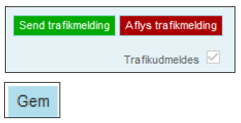 Vær opmærksom på, at et klik på "knappen" Send trafikmelding kun sætter et flueben i feltet Trafikudmeldes. "Knappen" Aflys trafikmelding fjerner fluebenet igen. Det er først, når du klikker på knappen Gem oven for fanebladet, at alle dine indtastninger på fanebladet bliver gemt. Samtidig sendes trafikmelding automatisk, hvis der vel at mærke er et flueben i feltet Trafikudmeldes.