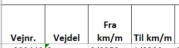 ![]() | De første 4 kolonne angiver basis information om strækningen. Det er vejnr., vejdel samt fra og til kilometrering. Inden for det enkelte vejnr og den enkelte vejdel finder der en eller flere delstrækninger i rapporten (rækker i Excel-filen). Strækningerne er opdelt efter et skifte i de undersøgte parametre, fx trafikmængder, AP-typer, sortplet eller ej. |