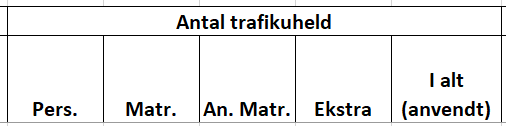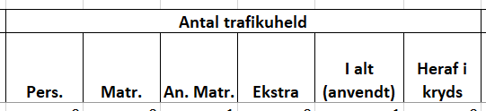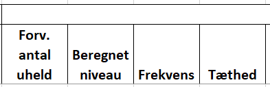 ![]() | Antal trafikuheld er delt op på personskade-, materielskade- og anden materielskadeulykker samt ekstrauheld. Her angives alle de ulykker, der er registreret på den givne strækning for den valgte periode. I kolonne ”I alt (anvendt)” angives det antal ulykker, der er anvendt i udpegningen. Det betyder, at hvis der fx valgt kun at udpege på baggrund af personskadeulykker, så vil det kun være dem der fremgår af denne kolonne. Du kan altid se i basisoplysningerne for udpegningen øverst i Excel arket, hvilke uheldsarter udpegningen er foretaget på baggrund af (række 6 i Excel arket). ”Heraf i kryds” angiver, hvor mange af ulykkerne i ”I alt (anvendt)”, der er registreret i kryds, men som pga. lidt eller manglende sidevejstrafik er overgået til at være en del af strækningsudpegningen, se nærmere forklaring i beskrivelsen af trafik under modelmetoden. For tæthed – øvrige overgår ingen kryds til strækningen, så ”Heraf i kryds” er altid 0 for denne metode. |