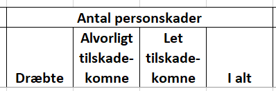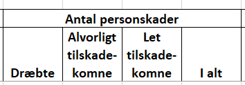 ![]() | I rapporten fremgår antallet af personskader registreret i krydset i den valgte periode. Personskaderne er delt op på dræbte, alvorligt og lettere tilskadekomne. Sidst angives antal personskader i alt. |