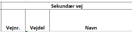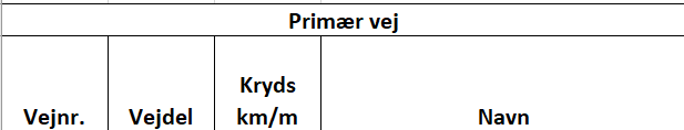 ![]() | Herefter vises 3 kolonner med basisoplysninger om sekundærvejen i krydset. I rapporten vises vejnr., vejdel og vejens navn. |