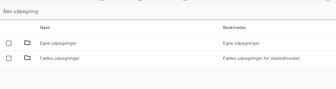 Du ser nu en oversigt med mapper - egne og fællesudpegninger, se Figur 3. Her vælges den mappe, hvor udpegningen skal placeres, ved at dobbeltklikke (eller alternativt: kryds boksen af og vælg åbn nederst i skærmbilledet). Mappen med ”Egne udpegninger” kan kun den enkelte bruger se. ”Fælles udpegninger” er en mappe fælles for den enkelte organisation, dvs. her kan deles med kollegaer.
