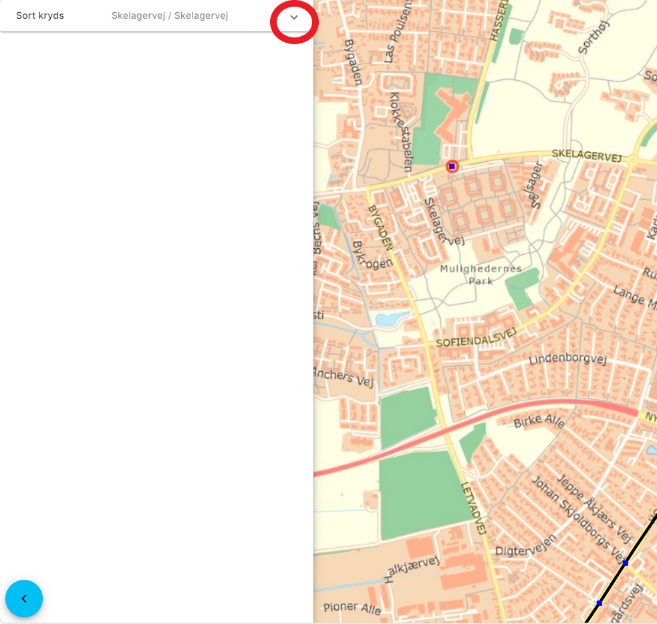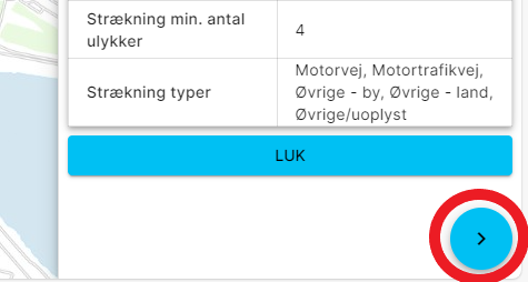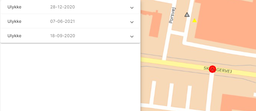 ![]() | Hvis uheldslaget er slået til, er det muligt at klikke på de enkelte ulykker/lokaliteter. Så vises en liste over ulykker på stedet i venstre side. Det er muligt at folde den enkelte ulykke ud og se yderligere detaljer med pilen til højre. Her er der også mulighed for at hente grundrapport for den enkelte ulykke. |