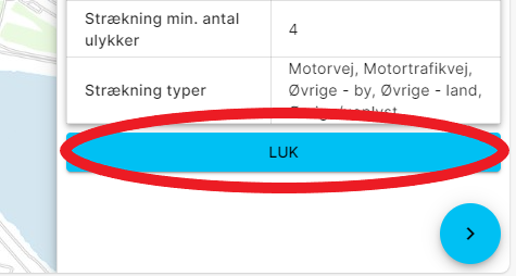 ![]() | Mulighed for at få vist lag på kortet eller ændre baggrundskort. Knappen er i venstre nederste hjørne af skærmbilledet. Lag i kortmodulet: Sorte pletter Helkilometre (hvis de ligger i vejman.dk) Gældende hastighedsgrænser (hvis de ligger i vejman.dk) Generelle hastighedsgrænser (hvis de ligger i vejman,dk) Trafiktal (ÅDT) (hvis de ligger i vejman.dk) Ulykker. I dette lag vises de seneste 5 hele afsluttede uheldsår. Her er der mulighed for at begrænse uheld til egen vejbestyrelse ved at vælge filteret til højre for ”uheld” i listen. |