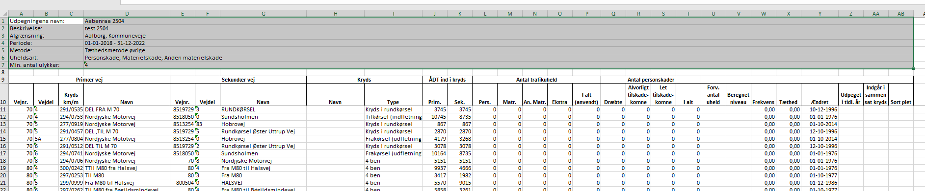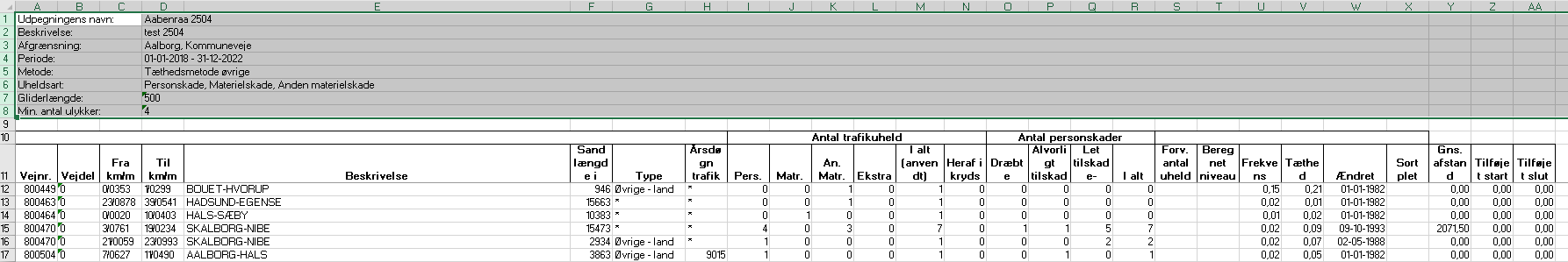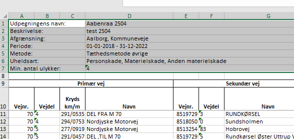 ![]() | Antal trafikuheld er delt op på personskade-, materielskade- og anden materielskadeulykker samt ekstrauheld. Her angives alle de ulykker, der er registreret i det givne kryds for den valgte periode. I kolonne ”I alt (anvendt)” angives det antal ulykker, der er anvendt i udpegningen. Det betyder, at hvis der fx er valgt kun at udpege på baggrund af personskadeulykker, så vil det kun være dem, der fremgår af denne kolonne. Du kan altid se i basisoplysningerne for udpegningen øverst i Excel-arket, hvilke uheldsarter udpegningen er foretaget på baggrund af (række 6 i Excel arket). |