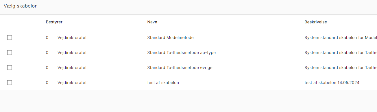 Der er mulighed for at redigere skabelonen ved at vælge ”Admin skabeloner” (en af de blå knapper i bunden af skærmbilledet). Her vil det være muligt at se de skabeloner, brugeren selv eller en kollega fra samme vejbestyrelse har oprettet. For de skabeloner brugeren selv har oprettet, vil der være mulighed for at redigere i skabelonen. Det er ikke muligt at rette i de tre grundlæggende skabeloner.