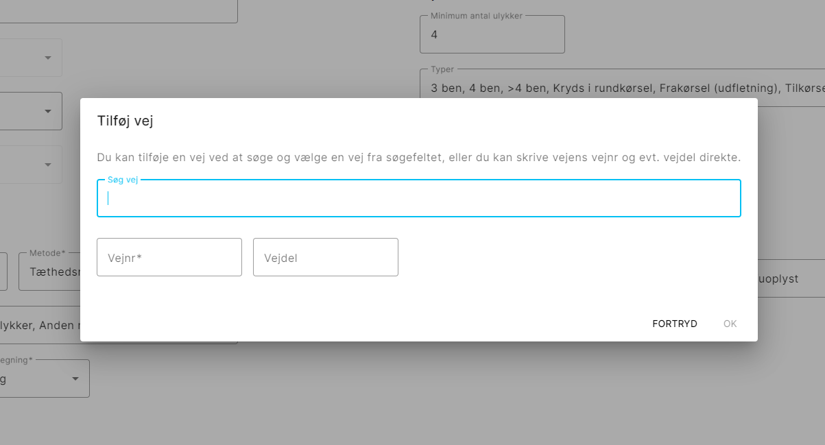 Herefter vises et skærmbillede, hvor der er mulighed for at søge en vej frem, se Figur 7. Der kan søges på vejens navn i søgefeltet eller skrive vejens administrative nummer direkte i formularen og eventuelt angive vejdel.