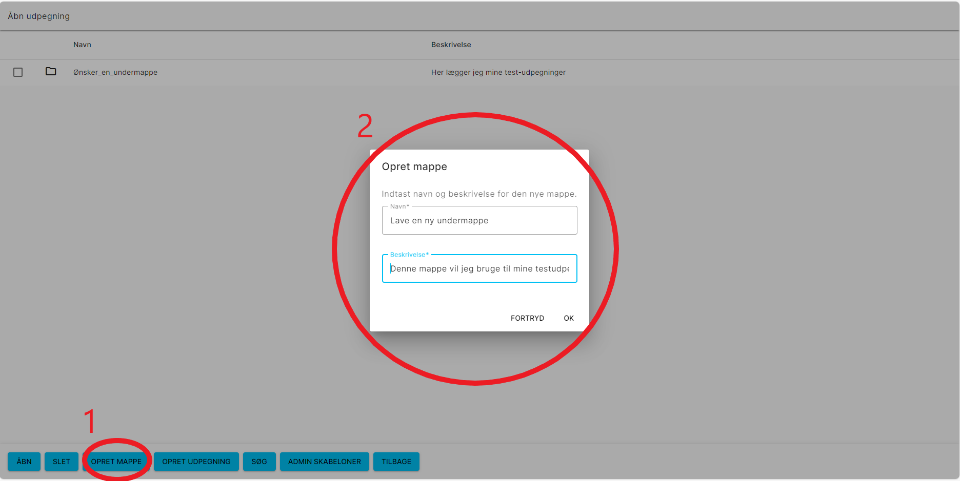 Der kan oprettes en undermappe til udpegningen (se Figur 4), eller udpegningen kan oprettes direkte i enten ”Egne udpegning” eller ”Fællesudpegninger” (Vælg ”opret udpegning”).