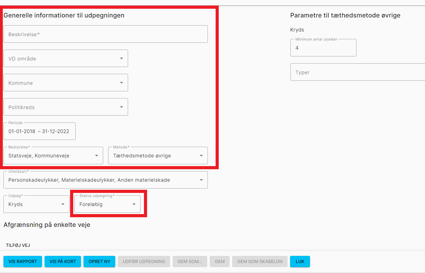 ”Status udpegning”. Her kan vælges mellem ”foreløbig” og ”endelig”. Det har ingen betydning for resultatet af udpegningen. Det har dog betydning for, om et kryds i de efterfølgende år markeres som værende tidligere udpeget som sort plet. Til at danne denne liste kigger programmet udelukkende i udpegninger defineret som ”endelig”. Et godt råd er derfor kun at lave én endelig udpegning af kryds og strækninger om året.