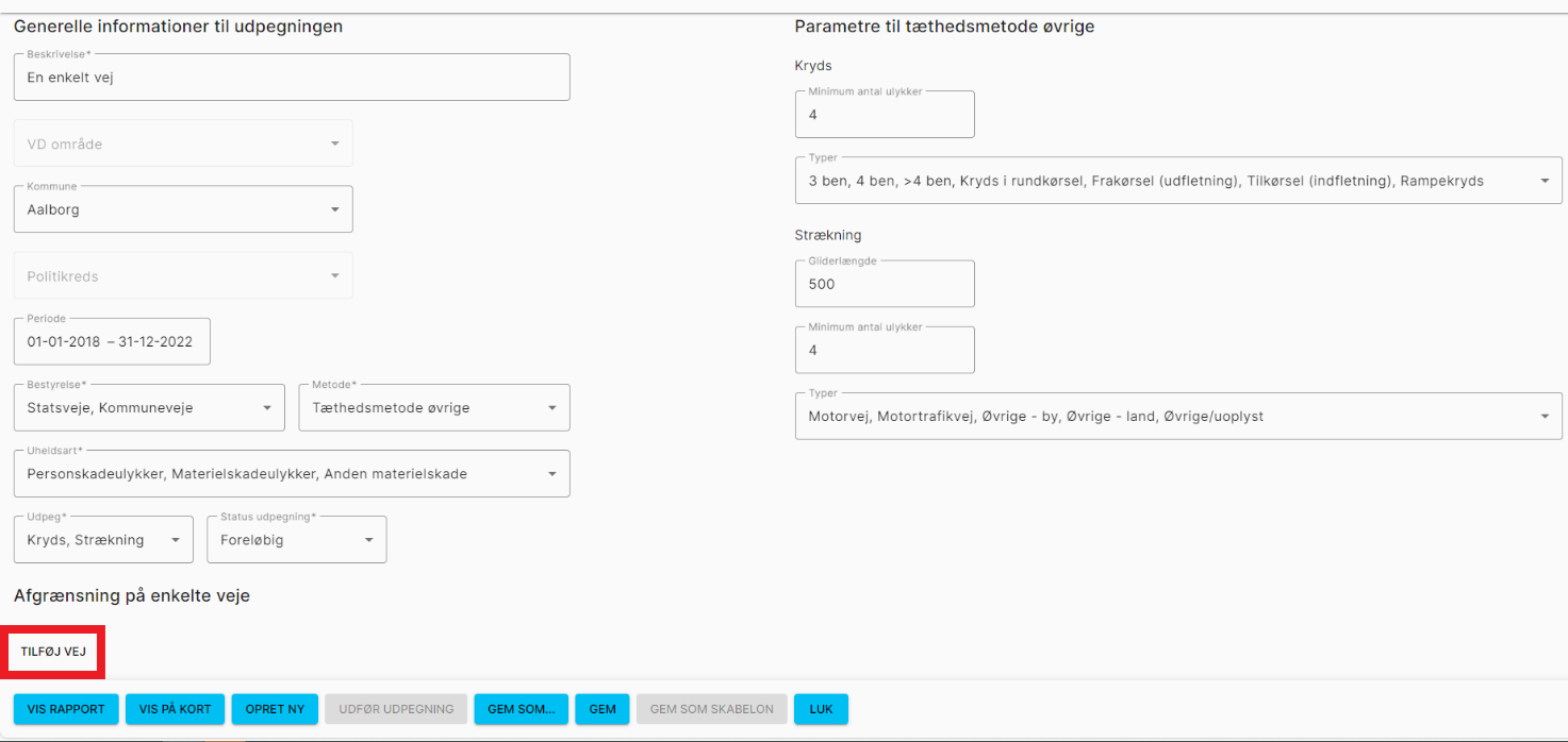 ![]() | I rapporten angives: Forventet antal uheld er baseret på ulykkesmodellen, og har derfor kun relevans i forbindelse med modelmetoden. Beregnet niveau angiver det beregnede udpegningsniveau for det aktuelle kryds. Dette har kun relevans, hvis der udpeges med modelmetoden. Ulykkesfrekvensen vises som antal ulykker (den/de uheldsarter, der er valgt som grundlag for udpegningen) pr. 1 mio. indkørende biler. Ulykkestætheden vises som antal ulykker (den/de uheldsarter, der er valgt som grundlag for udpegningen) pr. kryds pr. år. |