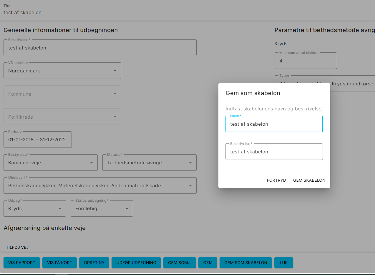 Når udpegningen er gemt, er der mulighed for at vælge en af de blå knapper nederst i skærmbilledet ”Gem som skabelon”.