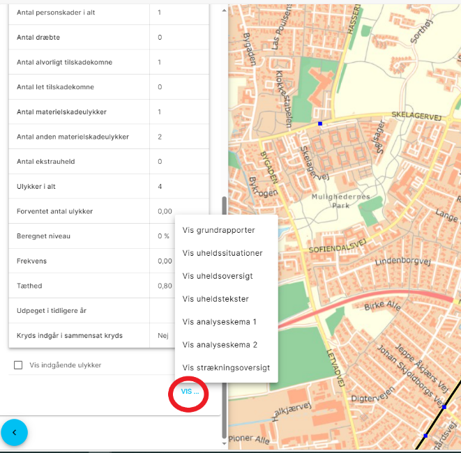 ![]() | Når de detaljerede oplysninger om en sort plet er foldet ud, kan du nederst vælge ”Vis” (markeret med rød cirkel). Her får du mulighed for at hente grundrapporter, uheldstekster, mv. for ulykkerne på lokaliteten. Du har også mulighed for at markere ”vis indgående ulykker”, så vil ulykkerne blive vist på kortet. De indgående ulykker er de ulykker den sorte plet/strækning er udpeget på baggrund af. Dvs. de ulykker der vises, er afhængigt af hvilken periode du har valgt, og hvilke ulykkestyper du har valgt til at indgå i udpegningen. |