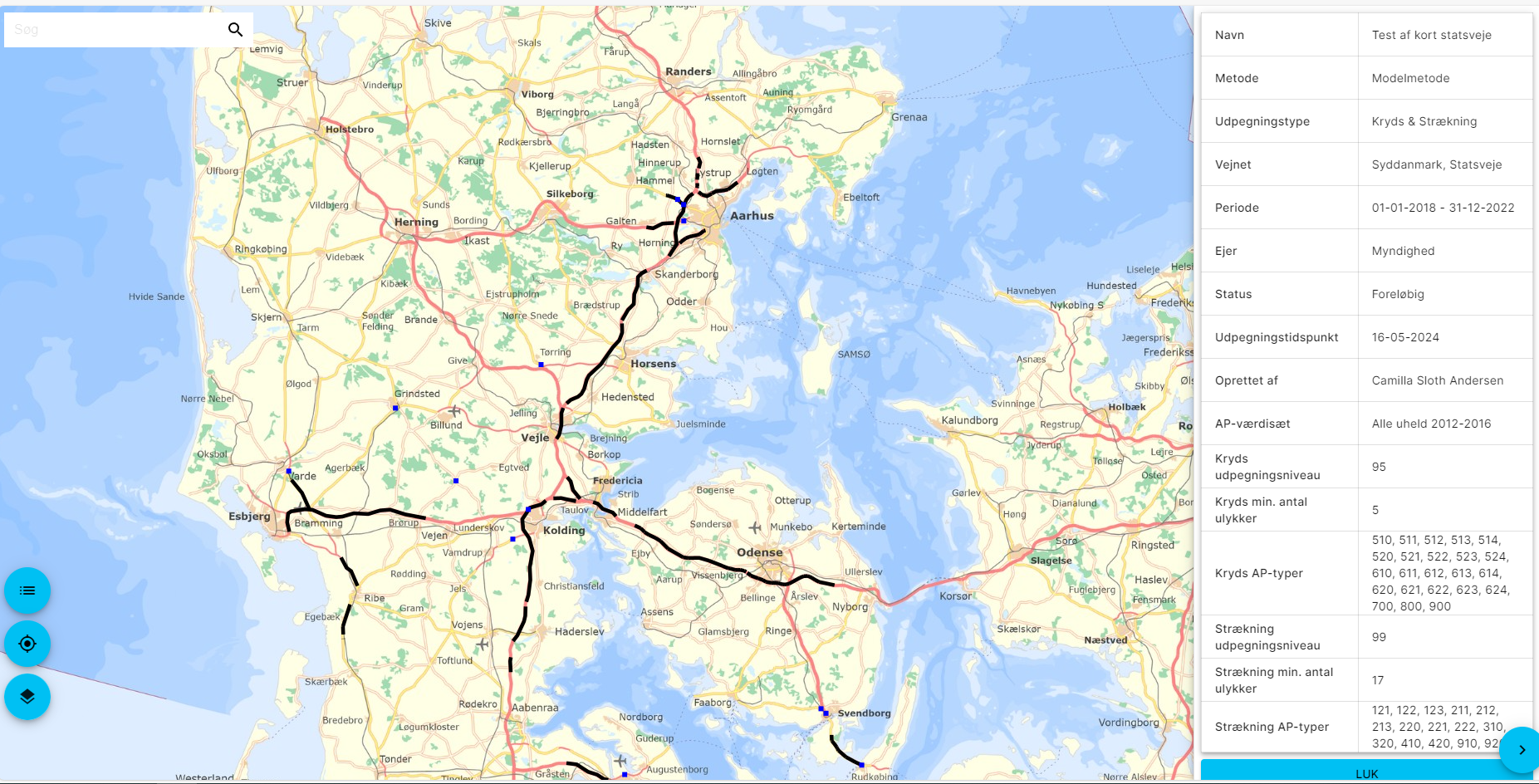 Figur 8: Resultat af sortpletudpegning på statsvejnettet i Syddanmark med modelmetoden.