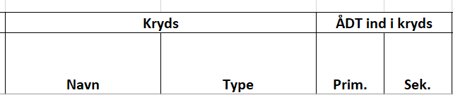 Trafik | Oplysning om ÅDT skal eksistere for alle ben, da der ellers ikke kan beregnes et forventet antal ulykker via modellen. Er der ben uden ÅDT, udelades benet i beregningerne. Dvs. at et 4-benet kryds uden ÅDT på det ene ben betragtes som et 3-benet kryds. Hvis der kun er trafiktal på 2 eller færre ben, udelades krydset helt. Kryds udelukkes også, hvis den samlede sekundære trafik er mindre end 250 for 3-benede kryds og 500 for 4-benede kryds. Ulykkerne regnes så i stedet med under strækningsudpegningen. |