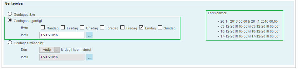 •De øvrige datoer vil fremgår af gentagelserne under overskriften: Forekommer.