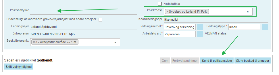 Man kan altid ændre sagsbehandleren ved at vælge en anden fra vejmyndigheden i drop-down menuen i identifikationstoppen og herefter klikke Gem.