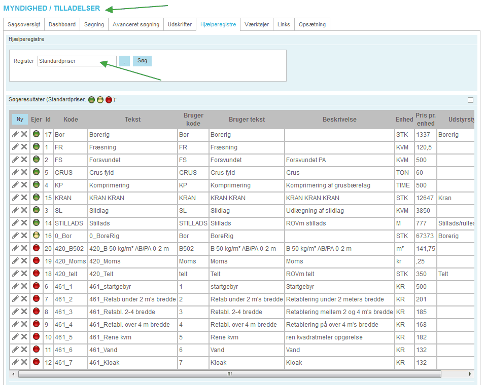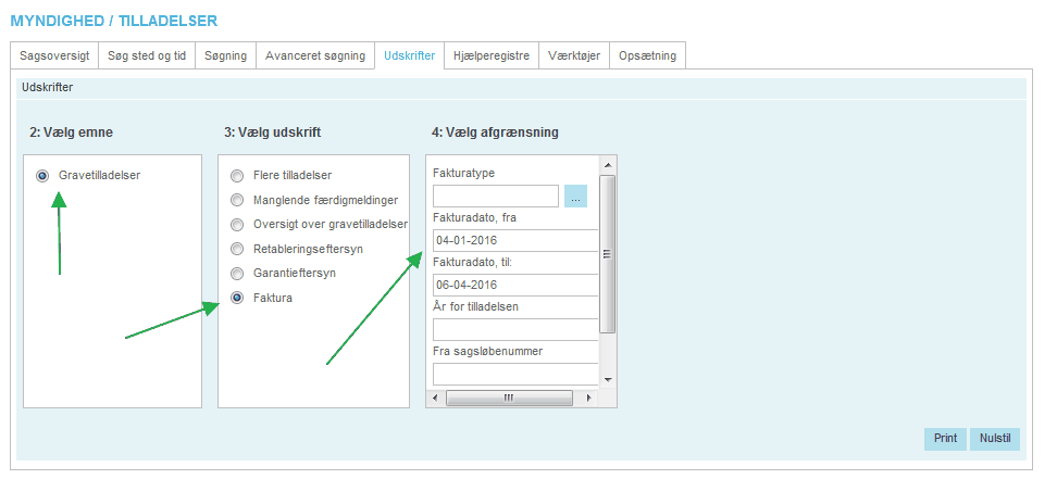 Udskriften omfatter både Gravetilladelser og Materieopstilling.