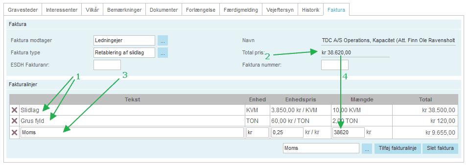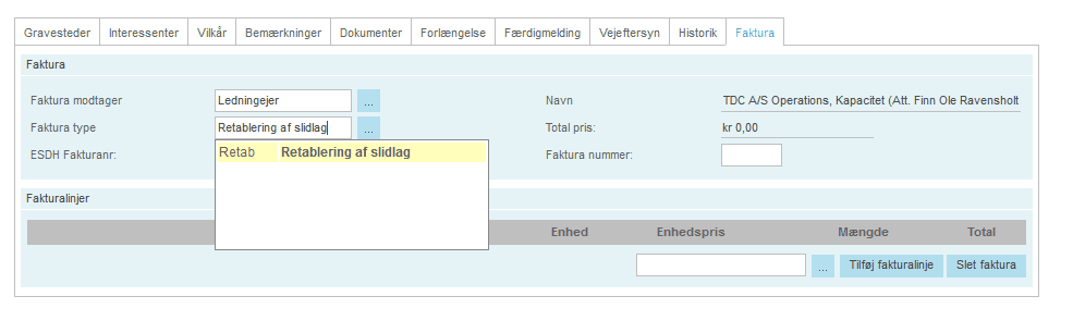 Her er ledningsejer valgt som modtager, og fakturatypen er Retablering af slidlag, som er en af de fælles fakturatyper. Husk at der skal være CVR-nummer på interessenten for sat det kan udskrives på fakturaen senere.