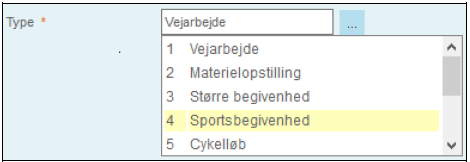 ![]() | Indholdet i feltet Type giver overskriften i trafikmeldingen. Klik evt. på den blå knap til højre med de tre prikker, hvis du ønsker en af de andre begivenhedstyper (aktiviteter) som overskrift i din trafikmelding. (Hvis feltet Hvad lige ovenfor er tomt, skal du udfylde det med f.eks. samme tekst som i feltet Type – systemet kræver, at feltet Hvad er udfyldt). |