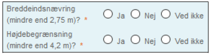 ![]() | Tag altid stilling til, om aktiviteten på vejen medfører en reduktion i den passable bredde til mindre end 2,75 m eller medfører en reduktion i passabel højde til mindre end 4,2 m. |