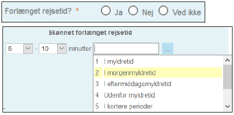 ![]() | Tag altid stilling til, om aktiviteten kan medføre en forlænget rejsetid. Vælg Ja, Nej eller Ved ikke. Hvis Ja, så angiv – hvis muligt – rejsetidsforlængelse og periode; det er muligt kun at oplyse en af disse informationer. Angiv et minutspænd vha. de to talfelter for at give dit bud på, hvor stor rejsetidsforlængelsen cirka vil være. Se bort fra forlængelser under to minutter. Præciser, hvornår på døgnet rejsetidsforlængel-sen mest sandsynligt kan forekomme. Klik på den blå knap til højre og vælg en periode fra listen. |