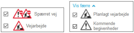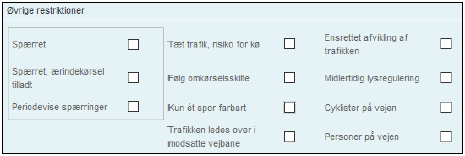 ![]() | Her kan du efter behov markere op til fire andre forhold på vejen, der kan påvirke fremkommeligheden. Du kan dog kun vælge én restriktion inden for kategorien spærring (de tre felter længst til venstre). |