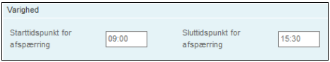 ![]() | Indtast, i hvilket tidsrum på døgnet de angivne restriktioner gælder (undgå tidspunktet 00.00, skriv 23.59 eller 00.01 for før/efter midnat), Udfyld kun felterne, hvis du er sikker på at afspærring opsættes i et bestemt tidsrum dagligt. |