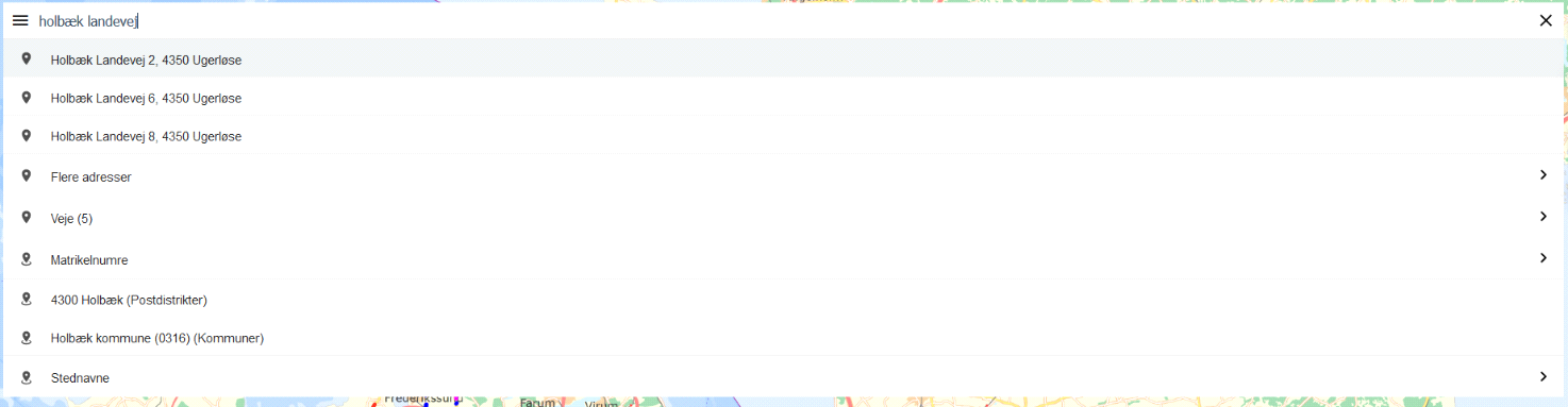 Her nedenfor er der søgt på Holbæk Landevej. Skriv navn og tryk på forstørrelsesglas.