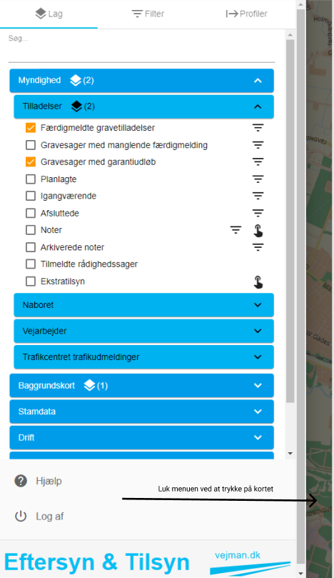 Menuen lukkes ved at trykke/klikke ude i kortet ved siden af menuen
