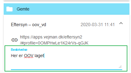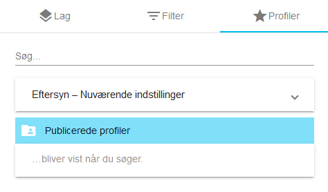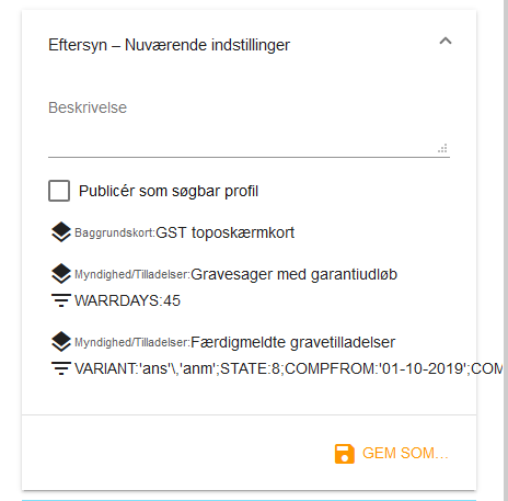 En gemt profil er din personlige profil. Skal andre kunne se den, skal den publiceres. Som det er nu er de publicerede profiler fælles for alle. Så giv din et navn, der gør at den nemt kan genfindes. Indled fx navnet med dit kommunenummer 420_eftersynsprofil. Se mere i afsnittet om Publicerede profiler.