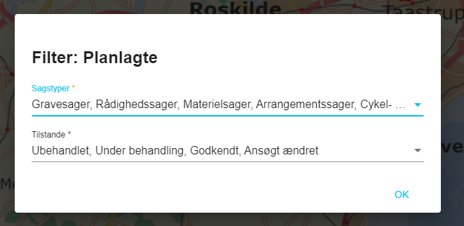 Kommune: Man kan nøjes med at vælge Kommune og herved se sager på statsvejnettet også. Man kan nu kun åbne sager fra egen vejbestyrelse.