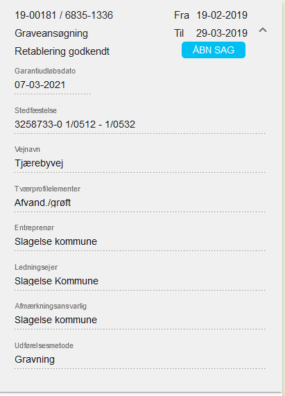 Klikker man på ”pil-ned symbolet: ”v” i den korte søgeoversigt, vises der flere detaljer for sagen, samtidigt med at kortet zoomer ind på stedet, og vejstrækningen blinker kortvarigt.