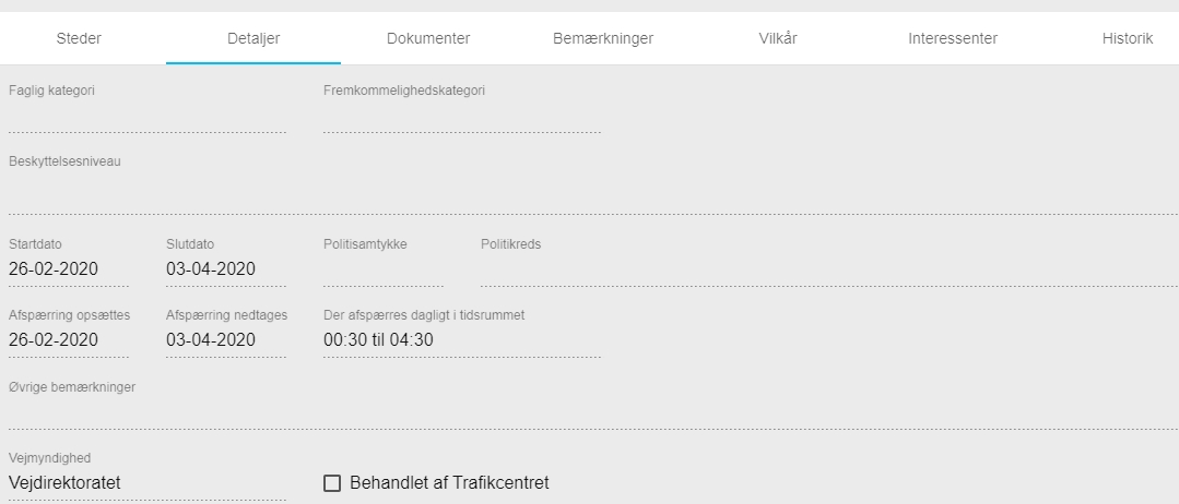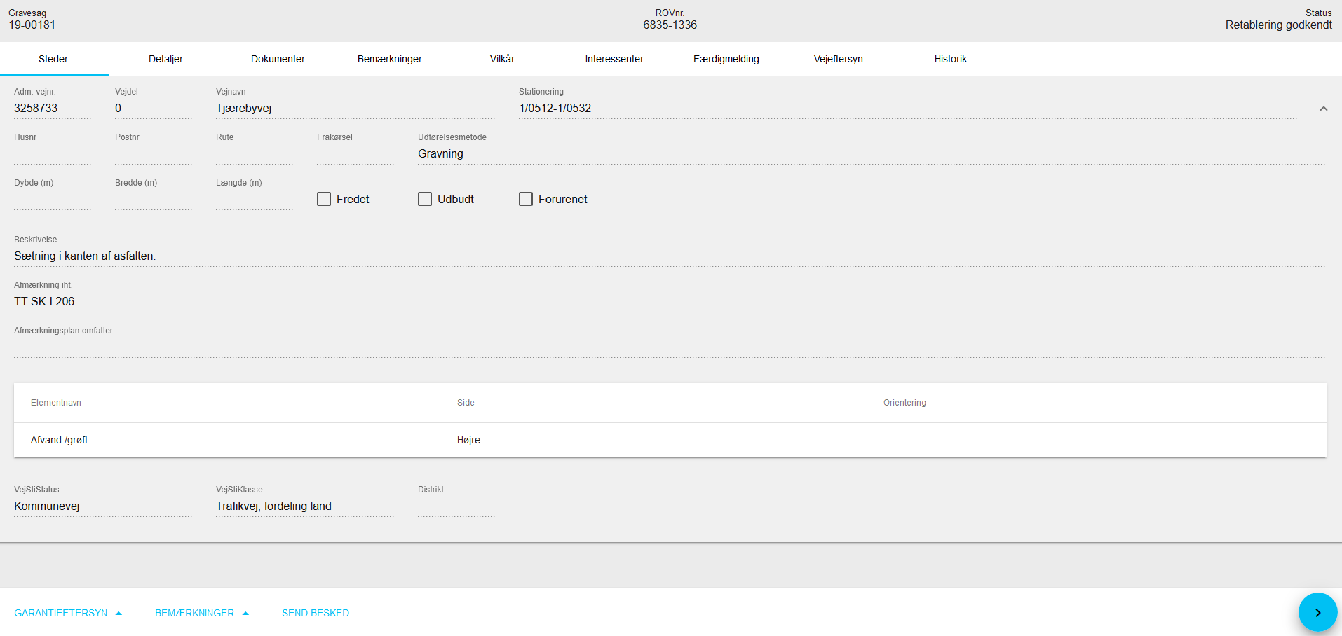 Åbnes en sag er der adgang til alle oplysningerne, (som i http://vejman.dk ) via en række faneblade øverst i skærmbilledet.