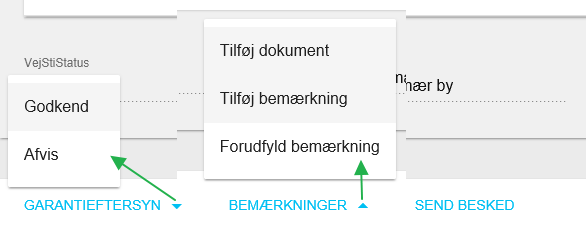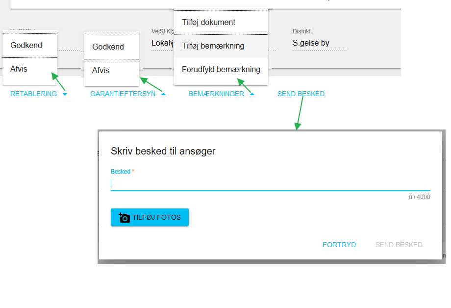 Du kan nu henholdsvis behandle retableringen, garantieftersynet, tilføje et dokument (herunder et billede), en bemærkning, skrive en såkaldt forudfyldt bemærkning, (en slags note der vil dukke op som forslag til teksten næste gang du skal godkende eller afvise sagen), eller sende en besked, som vist ovenfor.