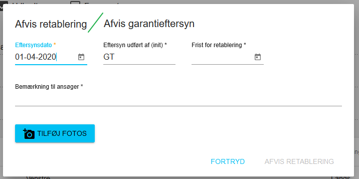 Afvises en retablering, eller et garantieftersyn vises en dialog, hvor man bl.a. kan tilføje billeder. På en tablet kan man tage et billede på stedet og vedhæfte dette på sagen direkte.