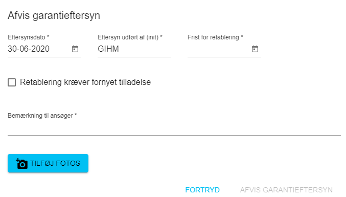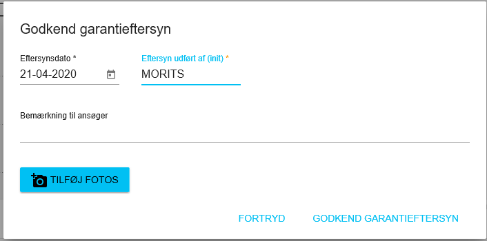 Læg mærke til at du kan springe direkte til at godkende garantieftersynet, hvis du umiddelbart kan se at alt er OK og der ikke vil opstå garantiproblemer. Du kan få sagen arkiveret ved at godkende garantieftersynet.